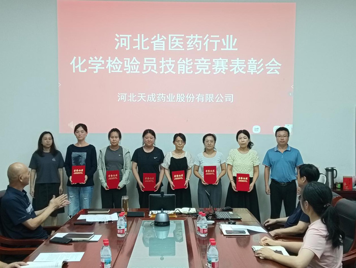 8月8日,公司在三廠會議室召開河北省醫藥行業化學檢驗技能比賽表彰會,對在此次賽事中斬獲佳績的團隊及個人進行表彰。中心化驗室、道恩藥業化驗員代表現場參會,渤海分公司化驗室人員通過小魚易連線上同步參與。會上,董事長王振剛發表重要講話,向獲獎集體與個人表示熱烈祝賀,并結合行業發展態勢對全體化驗員提出明確要求,為公司高質量發展注入強勁動力。