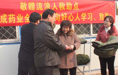 公司領導聽到這個消息深受感動,為公司能有這么一位好心的職工感到自豪。天成藥業,作為“娘家人”,作為一個有社會責任的企業,更要做好他們堅強的后盾。徐總受董事長總經理王振剛委托代表全體天成人送去1000元現金和十件御寒的大衣,希望這些款物能為那些無家可歸的人帶去溫暖,也希望所有天成人向他們學習。我們的企業宗旨是“制好藥·為人民”,我們應該樹立為人民服務、已成成人的大愛思想,用自己的愛心來服務企業、服務大眾、服務社會。