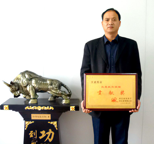 汶川大地震,捐獻價值100萬藥品,職工集資38560元。九月份,被河北省民政廳、慈善總會授予抗震救災貢獻獎。副總王顥捧著這塊獎牌非常高興。