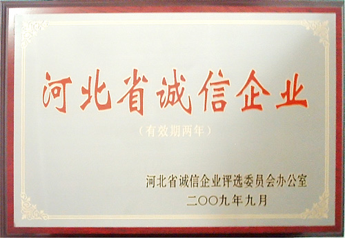 2009年9月,我公司被河北省誠信企業(yè)評選委員會評為“河北省誠信企業(yè)”,并被收入《河北誠信企業(yè)建設(shè)成果集》。證書及獎牌于近日發(fā)放到公司。