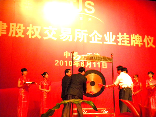 2010年6月11日上午9點(diǎn)29分,一個(gè)讓天成人永遠(yuǎn)銘記的時(shí)刻,隨著四柄紅槌一起敲響天交所的開(kāi)市銅鑼?zhuān)颖碧斐伤帢I(yè)股份有限公司股權(quán)在天津股權(quán)交易所鳴鑼開(kāi)市,當(dāng)日成交338000股,成交金額118.3萬(wàn)元。
