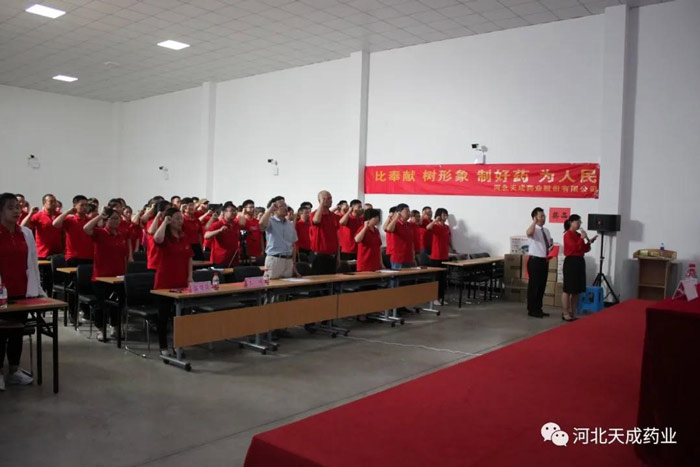 滄州經(jīng)濟(jì)技術(shù)開發(fā)區(qū)企業(yè)黨委負(fù)責(zé)人曲明利發(fā)表講話,他稱贊天成藥業(yè)黨總支部近年來組織建設(shè)成果顯著,黨員精神風(fēng)貌良好,鼓勵我們再接再厲。